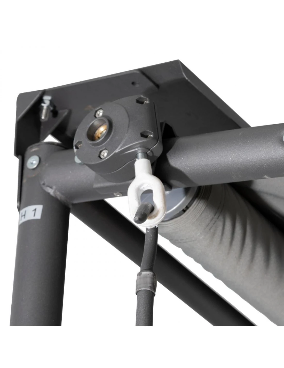 Pergola adossĂ©e en acier Ă©poxy qui Ă l’avantage d’avoir une toile ajustable par manivelle !