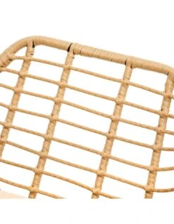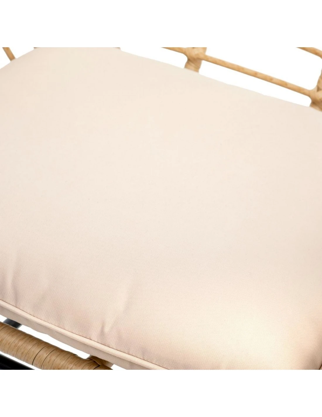Salon 2 personnes tendance, avec sa résine synthétique aspect rotin qui comprend 2 fauteuils et leur coussin, 1 table basse ronde avec 1 plateau en verre trempé.
