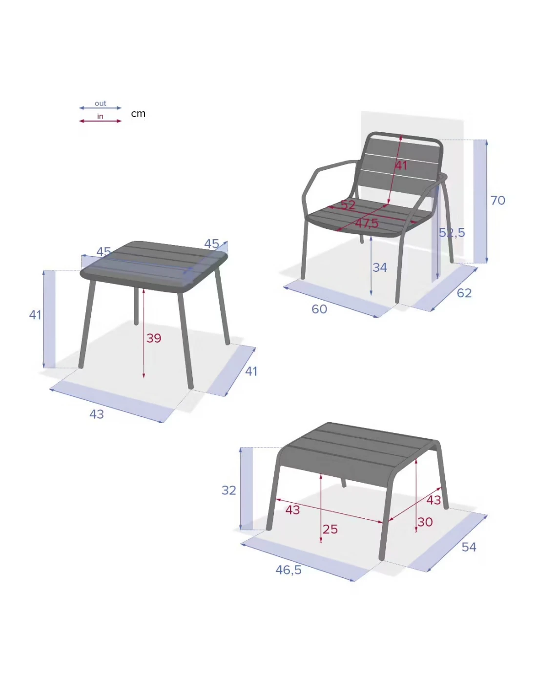 - Table : L. 45 x P. 45 x H. 41 cm (4,3 kg) Fauteuil : L. 68 x P. 47,5/67 X H. 70,5 cm (6,3 kg) Repose pied : L. 49 x P. 40/55 x H. 33 cm (2,8 kg) Hauteur d’assise : 36 cm Hauteur accoudoir : 54,5 cm