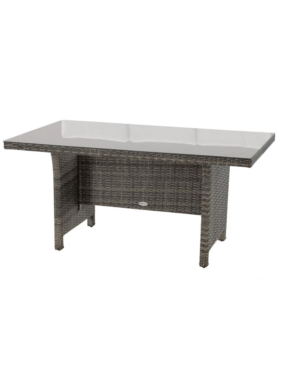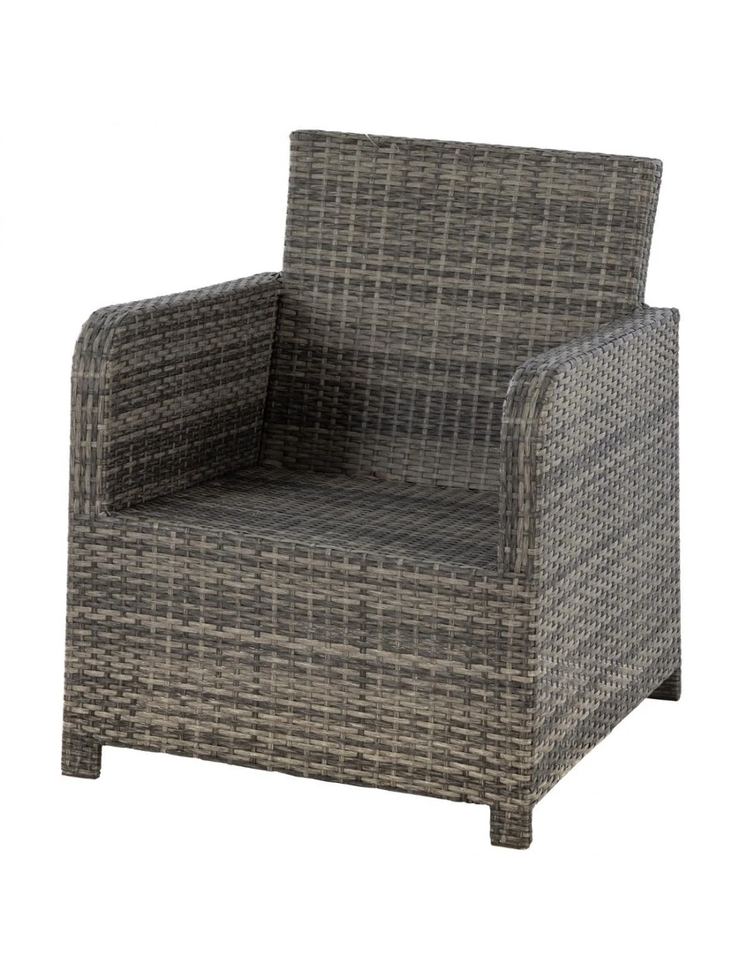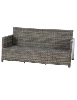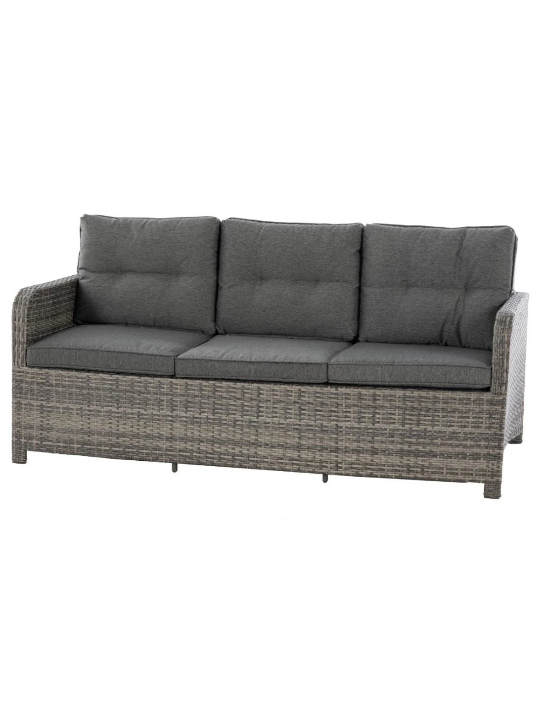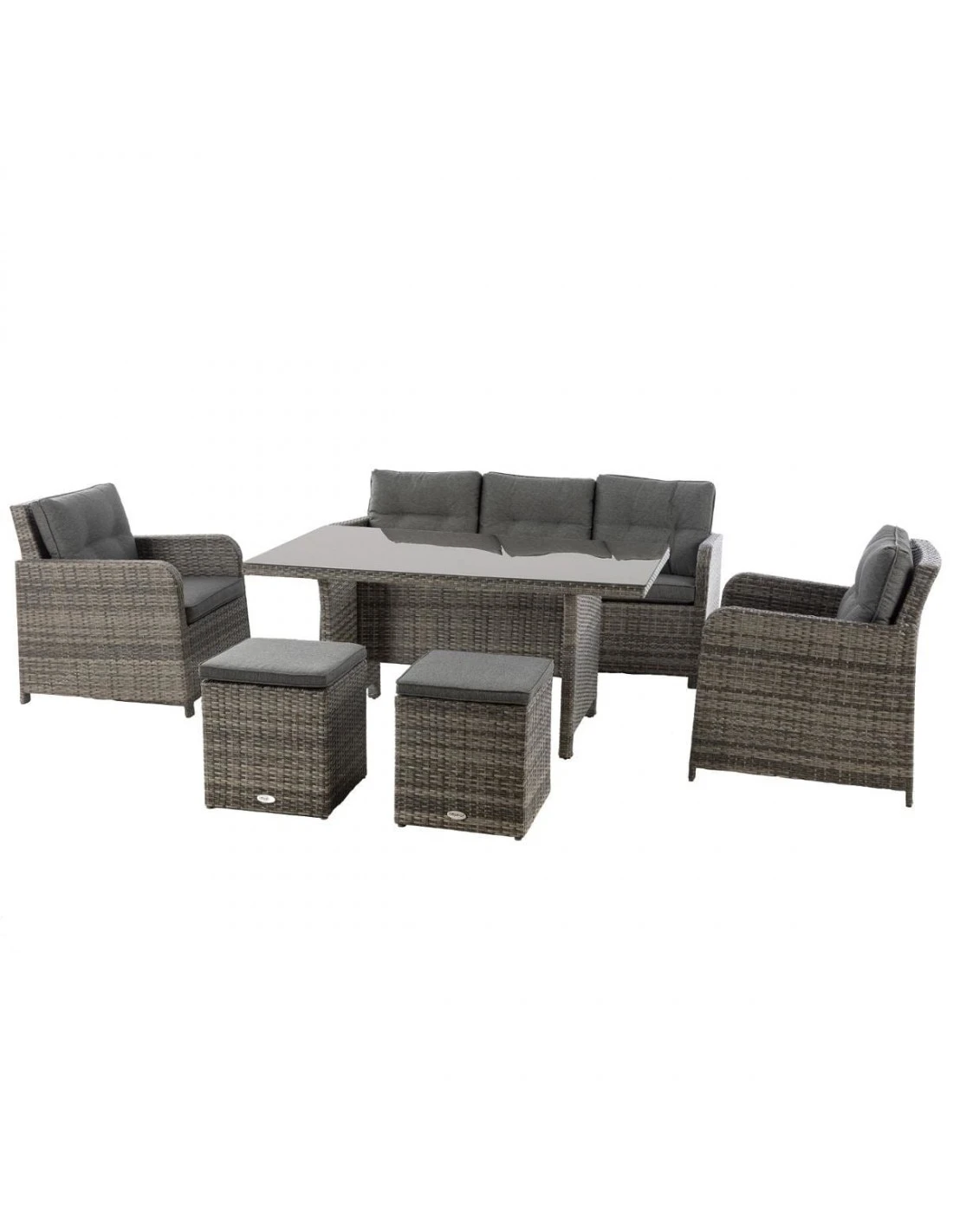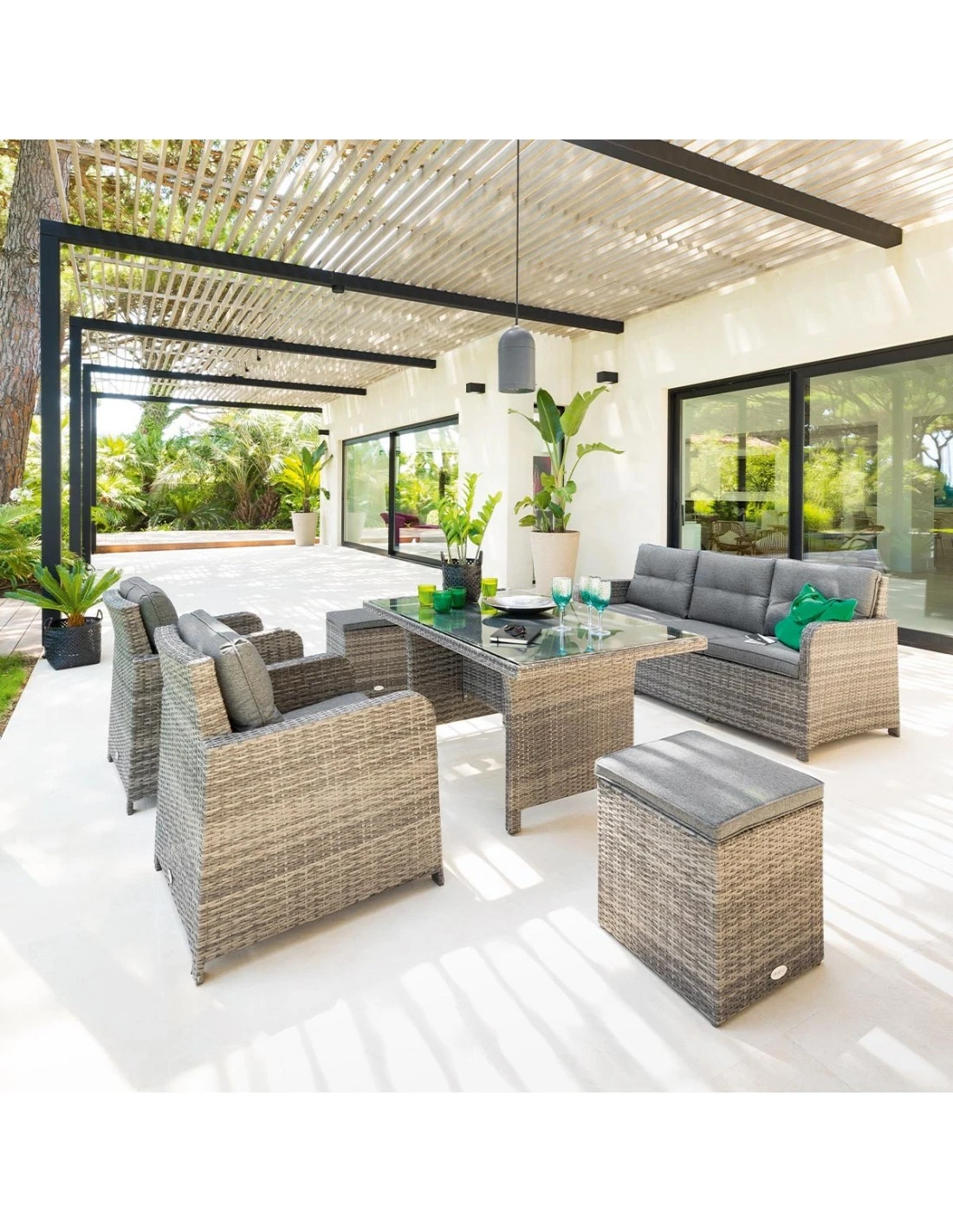 Salon de jardin en résine tressée, composé d’une banquette 3 places, 2 fauteuils, 2 poufs, une table haute, et des coussins épais !