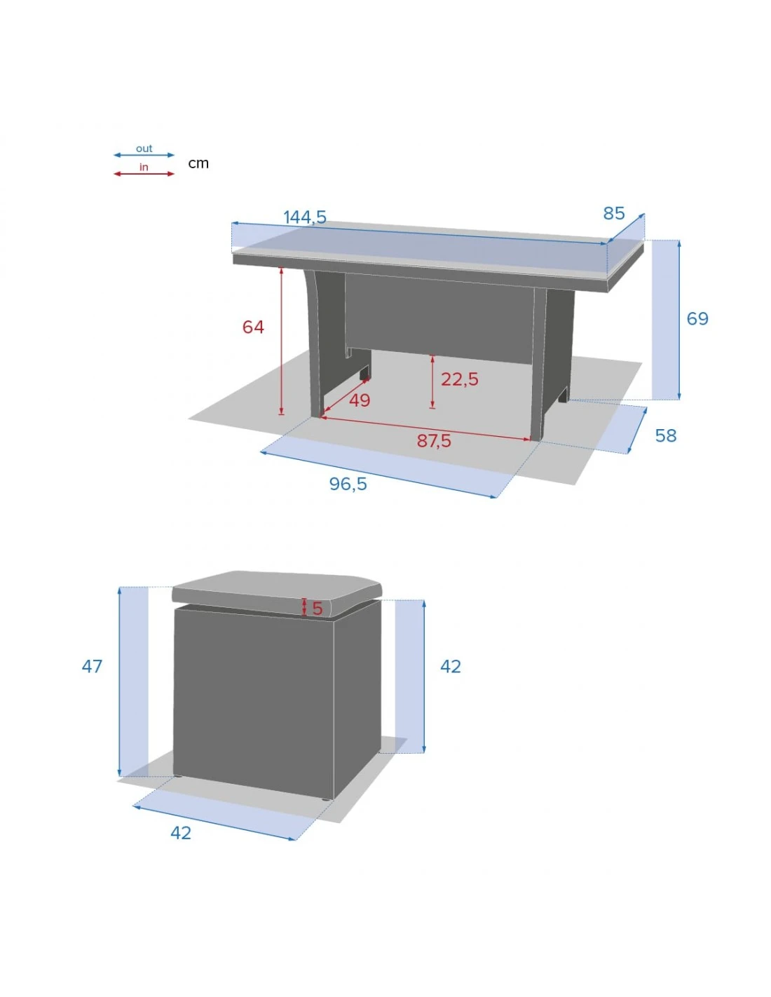 - L. 42 x P. 42 x H. 47 cm